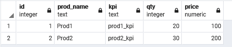 createtableinventory ( idserialnotnull, prod_nametext, kpitext, qtyinteger, pricedecimal, unique(kpi) ); --added some records to inventory insertintoinventory(prod_name,kpi,qty,price) values('Prod1','prod1_kpi', 20, 100), ('Prod2','prod2_kpi', 30, 200); |