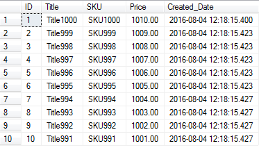 CREATETABLEInventory( IDBIGINTIDENTITY(1,1)PRIMARYKEY ,TitleVARCHAR(500) ,SKUVARCHAR(20) ,PriceDECIMAL(18,2) ,Created_DateDATETIME ,Updated_DateDATETIME ) DECLARE@cntINT=1000 WHILE(@cnt>0) BEGIN INSERTINTOInventory(Title,SKU,Price,Created_Date,Updated_Date) SELECT'Title'+CONVERT(VARCHAR(5),@cnt),'SKU'++CONVERT(VARCHAR(5),@cnt), 10+@cnt,GETDATE(),GETDATE() SET@cnt=@cnt-1 END |